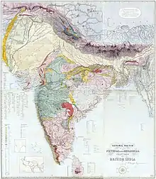 In 1843, he started to prepare a geological map of British India. In 1852 he produced a series of maps of Hindustan, mainly hydrographical, defining all the important elements of the ten water basins of the Indian Peninsula (for the Asiatic Society), and in 1854 a large-scale geological map of the whole of British India, published as a 'General Sketch of the Physical and Geological Features of British India.[30] Greenough never visited India but much as he had done for his earlier maps of England and Wales, he compiled his map from scraps of information gathered from many observations of officers in the East India Company who were provided forms to submit. He was assisted in this effort by Colonel William Henry Sykes of the East India Company and sixty copies of the map were purchased by the company for distribution.[31][32] One of Greenough's key strengths was his assiduous ability to collect and collate information for his empirical cause. However, this 'remote' method of map construction resulted in 53 errors on his India map, some topographical as well as geological and palaeontological, that were listed by a committee led by Thomas Oldham, Director of the Geological Survey of India, in 1856.[33] Nevertheless, Greenough's geological map of India was a pioneering effort.