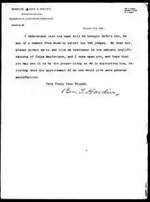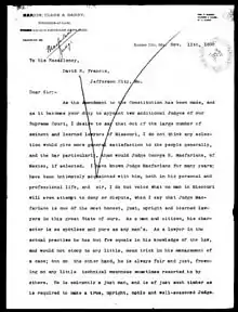 In 1890, a constitutional amendment was passed increasing the number of judges on the Missouri Supreme Court from five to seven.[2] MacFarlane was asked to fill this spot by Governor David Rowland Francis. MacFarlane's term was up in 1892, but he was re-elected as a judge by the people of Missouri.[1] MacFarlane was elected for a ten year term, but died only six years later.[2]