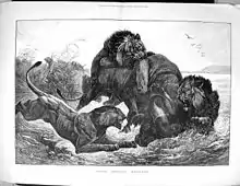 His first painting exhibited at the Royal Academy in 1856, was ‘Hunters.’ Then followed ‘The Casuals’ in 1866, ‘Home to die: an afternoon fox with the Cotswolds’ in 1868, ‘The Tournament’ in 1870, and ‘Sale of New Forest Ponies at Lyndhurst’ in 1872. In 1875, he exhibited a large painting, some fourteen feet in length, depicting ‘Lord Wolverton's Bloodhounds’ - this was highly praised in Whyte-Melville's ‘Riding Recollections.’ Followed this in 1876 was ‘Colt-hunting in the New Forest’, in 1877 ‘The Fall of Man’ from Milton's ‘Paradise Lost’ and in 1879 ‘The Struggle for Existence’, now in the Walker Fine Art Gallery in Liverpool. In 1881 ‘Rescued’, in 1883 ‘Love and War: in the Abbotsbury Swannery’ and in 1885 ‘Cowed’. ‘The Fall of Man’, depicting a scene from Milton's 'Paradise Lost,' was widely praised and singled out by the Royal Academy for its portrayal of "the savagery of the brute nature ensuing upon the disobedience of Adam and Eve".[1]