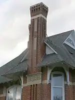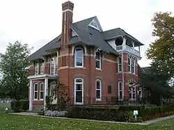 The Queen Anne's Stylehouse was built in 1885 by George and Charity Brown.[3] The contrasting colors of brick are characteristics of this style. The smooth white limestone horizontal band encircle the house, contrasting with the rough red brick. The brick was obtained locally from the Porter brick yards. more contrast is achieved with the straight exterior walls broken by the two-story bay windows on the east and front of the building. The front bay has George Brown's initials and date of construction in white limestone. Asymmetrical shapes are characteristic of the Queen Anne style. The architect, Cicero Hine, blended a variety of stone, from plain and decorative molded bricks, and limestone trim. Additional variation comes from the patterned wooden clapboards on the third floor balcony.[4] The decorative variations in porches and balconies are highlighted by dormers, decorative gables and fanciful brackets under all the overhangs. Originally there was a wide veranda across the front and around the east side.[5]