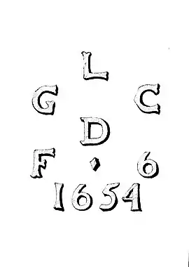 ![]() Inscription on the leaden coffin of George Brydges, 6th Baron Chandos of Sudeley Inscription on the lead coffin of George Brydges | |