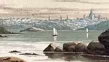 Following the matches against Carlton, the Waratahs adopted Australian rules, and for a time, the colonial game threatened to become the dominant code in Sydney.[15] During this period, Coulthard accepted an invitation to travel to Sydney to help foster Australian rules.[16] On 15 September 1877, soon after his arrival, Coulthard joined several local footballers on a fishing trip in Sydney Harbour. The group was anchored off Shark Island when Coulthard, sitting on the boat's gunwale with the back of his tailcoat hanging over the side, was pulled overboard by "a monster shark, 13 feet long". The shark had seized his coattails trailing on the water and dragged him beneath the surface "some ten or twelve feet" until it tore the coat from his body. After kicking at the shark, Coulthard swam to the surface alongside the boat, "into which he threw, with the aid of his friends, a kind of somersault, just about as quickly as he had been taken overboard."[17] The incident was said to be "one of the most marvellous escapes from a fearful death on record" and "probably without parallel in Australian waters".[17]