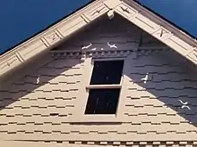 The house has three staircases. The railing of the main staircase which leads from the entry hall to the second level is decorated with wood squares that were originally made by the Smoot Lumber Company of Alexandria. When the staircase was restored in the 1990s, Smoot was able to locate the original saw blade to make the replacement squares.[20] One of the most interesting and unusual features of the house is the carvings in the exterior eaves that, when the sun shines, creates shadows that make it appear as if birds are flying against the house. The house was painted white for more than 70 years. During the 2012 renovation, the removal of an area of dry wall revealed a layer of green paint on the exterior. Based on the paint discovery and an old photo, the house was recently repainted to what is believed to be more historically accurate colors.