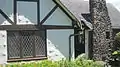 Diamond-paned casement window & lava-rock chimney with monogram "O"