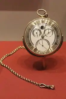 A yellow gold chronograph pocket watch made by George Daniels, the Space Traveller's Watch I, ranks as one of the 20 most expensive watches ever sold at auction, fetching £ 3,615,000 in London on 2 July 2019.[2]