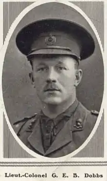 George Eric Burroughs Dobbs (21 July 1884 – 17 June 1917) was Irish born and played international rugby union for England (2 caps as a flanker in the 1906 Home Nations Championship[1]), and served with the British Army from 1904. He served during the First World War, and was promoted to lieutenant colonel. He was killed at Poperinge in 1917 while surveying a cable trench when a stray artillery shell fatally wounded him. He died of wounds later that day.[2]