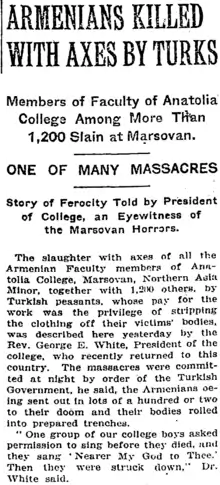On August 19, Turkish authorities visited the Anatolian colleges and demanded deportation of all Armenian students and teachers.[7] White "refused to tell" where Armenians were hiding so as to save them from getting deported or killed.[1] However, the officials threatened to execute the College staff if the Armenians weren't handed over.[1] White then agreed to hand the Armenians over and then held a prayer service for the deportees sent with the Turkish officials. The Armenian males were then separated from the women and shot outside of the city.[7] The women were deported to the Syrian desert, and none ever returned.[7] White later remarked, "thousands of women and children were swept away. Where? Nowhere. No destination was stated or intended. Why? Simply because they were Armenians and Christians and were in the hands of the Turks."[1]