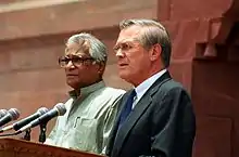 George Mathew Fernandes[3] (3 June 1930 – 29 January 2019) was an Indian trade unionist, statesman,[4] and journalist,[5] who served as the 22nd Defence Minister of India from 1998 until 2004. He was a member of Lok Sabha for over 30 years, starting from Bombay (present-day Mumbai) in 1967 till 2009 mostly representing constituencies from Bihar.[6] He was a key member of the Janata Dal and the founder of the Samata Party. He held several ministerial portfolios including communication , industry, railways, and defence.[7]