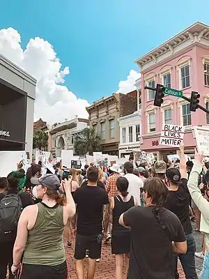 Hundreds of protesters attended a rally downtown on the morning of May 31.[16][17] Protesters initially blocked the entrance to the Myrtle Beach Police Station in what felt like a "standoff" but when officers joined in and the Chief addressed the crowd cheered.[18] Mayor Brenda Bethune declared a civil emergency due to a "credible threat" against police related to the protest. A curfew was set to start at 7pm May 31.[19][20]