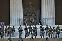 During the day, several hundred protesters gathered peacefully, kneeling with raised fists at the steps of the Lincoln Memorial, which in previous days had been blocked off by National Guard soldiers.[41] A large die-in was held for over eight minutes at the Martin Luther King Jr. Memorial as well.[36] Around 8pm,[41] a thunderstorm rolled in and dispersed protesters at the White House.[41] Two National Guardsman, non-critically injured by a lightning strike in Lafayette Square shortly after midnight, were the only reported casualties of the protests.[36]