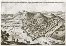 From March to June 1620 George Frederick blocked the road from Breisach to Freiburg by order of the Protestant Union, operating from a fortified camp at Ihringen. The goal was to prevent the passage of mercenary troops of Bavaria and the Catholic League from the Alsace to their assembly points at Lauingen and Dillingen on the Danube. Nevertheless, after Emperor Ferdinand II gave assurances that certain troops had been recruited for himself and not for Bavarian/Catholic League army, George Frederick allowed the three regiments to pass[18] and had to put up with being called naïve when these regiments joined the army of Duke Maximilian I of Bavaria.