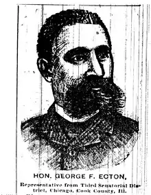 George French Ecton (1846 – September 19, 1929) was a civil rights activist and the second African American state legislator in Illinois. He was born a slave in Winchester, Kentucky, in 1846 to Antonio Ecton and Martha George. In June 1865, after the American Civil War and the abolition of slavery, George and a friend received free papers in the mail and set off to escape slavery, as they were still being held in bondage. When they arrived in Cincinnati, Ohio, they were hired as deck hands on the steam packet Sherman, working a route between Cincinnati and Wheeling, West Virginia. Later, in Cincinnati, George worked at hotels, including the Broadway House, Walnut Street House, Burnett House, and Spencer House. He became ill with smallpox while at the Walnut Street House, but recovered. He also began to attend night school taught by Luella Brown.[1] He was reported to be a college graduate.[2]