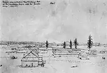 In the spring of 1849, weary of practicing law, Gibbs was drawn to the West by the California Gold Rush.[7] His brother Alfred being attached to the Regiment of Mounted Riflemen,[8] he traveled to Fort Leavenworth, arriving on May 8, 1849, and attached himself to the Regiment which was then under the command of Colonel William W. Loring, its previous commander, Brigadier General Persifor F. Smith, having been given command of the Pacific Division of the Army. [lower-alpha 1] The Regiment had been dispatched to the Oregon Territory, and both Gibbs and Major Osbourne Cross documented its overland travel along the Oregon Trail to Fort Vancouver[10] to which they arrived on October 4 of that year.[11] In addition to a diary, Gibbs recorded the journey on a copy of John Charles Frémont's map Map of an Exploring Expedition to the Rocky Mountains in the Year 1842, Oregon and North California in the Years 1843–44.[lower-alpha 2]