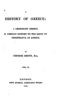 - Grote, George (1846). A History of Greece: I. Legendary Greece II. Grecian History to the Reign of Peisistratus at Athens. Vol. II. London: John Murray. Retrieved 14 October 2017 – via Internet Archive.
