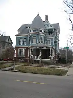 The house's front entrance is located within a circular porch supported by turned columns; the porch's roof is topped by a small balcony. An octagonal tower with stained glass windows and a bell-shaped dome is located behind the porch. A second-floor balcony with a mock half-timbered gable is partially hidden behind the right side of the tower. A small octagonal dormer, also featuring stained glass windows, is located to the left of the tower.[2]