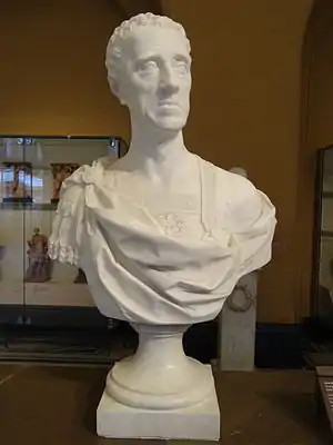 Hamilton died at his home at Albemarle Street in London on 29 January 1737 and was buried at Taplow Court.[3] In 1733 Michael Rysbrack, a sculptor from Antwerp, carved a marble bust of Hamilton in the form of a Roman centurion. As a boy, Rysbrack would have witnessed Hamilton's unopposed entry into Antwerp shortly after his victory at Ramillies. The bust is now in the Victoria and Albert Museum.[9]