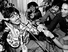 Following an accident at Friar Park when a tractor drove over his foot, Harrison required a walking stick during his brief promotional visit to the US. He made fun of his predicament by using a wheelchair when departing from Heathrow.[102] On 8 March,[103] at the Dark Horse Records offices in Los Angeles, Harrison gave his first US press conference since the start of his 1974 tour.[104] In journalist Rip Rense's later description, he was "promptly surrounded – and almost suffocated" by the reporters[105] as microphones were thrust in his face.[104][nb 9] Harrison's lightheartedness extended to the usual questions about when the Beatles might re-form;[31] the Associated Press photo from the event showed him holding his hands up to his ears in response.[103] Dismissing the recent multi-million-dollar offers for a reunion concert, he said, "The Beatles can't save the world. I mean, we'll be lucky if we can save ourselves."[105][106] When a reporter asked whether "something less than a full reunion" was likely, Harrison suggested they could meet for a cup of tea and televise the proceedings via satellite.[107] He added that he and his former bandmates would have a "great time" together, and "the only thing that would spoil it would be all of you with the cameras and microphones!"[108]