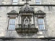 A statue of Heriot stands within the quadrangle of the school, above the pend on the north entrance tower. This is by Robert Mylne the King's Master Mason. It bears a Latin inscription which translates as: "This statue shows my body, this building shows my soul".[26]