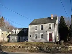 The George Hopkinson House is a historic colonial First Period house in Groveland, Massachusetts. Built c. 1716, it is a rare surviving single cell house from the period. Most First Period houses were built in their first stage as a chimney section and a two-story section to one side, with one room on each floor, and were later extended with additional rooms on the other side of the chimney, giving colonial rooms their characteristic five bay appearance. Because this one was never extended in this way, it exhibits a three bay front, with a door in the right-side bay, in front of the chimney. A rear leanto section was added later in the 18th century, and the side ell was added in the 19th century. The house is also a rare regional instance of plank frame construction (similar to Groveland's other First Period house, the Joseph Hardy House).[2]