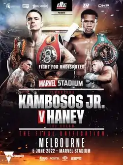 George Kambosos Jr. vs. Devin Haney, billed as Fight for Undisputed, is an upcoming lightweight unification professional boxing match contested between WBA (Super), IBF, WBO, and The Ring lightweight champion, George Kambosos Jr., and WBC lightweight champion, Devin Haney. The bout is set for 4 June 2022, at Marvel Stadium in Melbourne, Victoria, Australia, with the winner set to become the first undisputed lightweight champion since Pernell Whitaker in 1990, and the first in the four-belt era.[1]