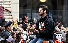 Due in part to a back injury suffered by Yankees catcher Austin Romine, the Yankees traded Kontos to the San Francisco Giants in exchange for catcher Chris Stewart before the start of the 2012 season.[21][22] He began the season with the Fresno Grizzlies of the Class AAA Pacific Coast League.[23] After starting the season with a 2–0 win–loss record and a 1.71 ERA in 23 appearances, the Giants promoted him to the major leagues on June 10.[24] Through August 14, he pitched to a 2.33 ERA and a 1.15 walks plus hits per innings pitched (WHIP) ratio in 26 games, becoming a reliable member of the Giants bullpen.[25] Kontos got his first major league win in relief of Barry Zito, successfully recording 7 outs without allowing a baserunner. The Giants went on to win the game 6–4 against the Astros. Kontos entered the postseason for a second straight season and eventually won the 2012 World Series with the Giants in a four-game sweep of the Detroit Tigers.