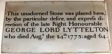 Lord Lyttelton was the eldest son of Sir Thomas Lyttelton, 4th Baronet, of Frankley, in the County of Worcester, by his wife Christian, daughter of Sir Richard Temple, 3rd Baronet. Educated at Eton and Christ Church, Oxford, he afterwards went on grand tour, visiting Europe with his tutor. It was during this time that he started publishing his early works in both poetry and prose. Even after he was elected to Parliament in 1735, he continued to publish from time to time. In 1742 he married Lucy, daughter of Hugh Fortescue,[1] and following her death in 1747 he later married Elizabeth, daughter of Field Marshal Sir Robert Rich, 4th Baronet, in 1749. He died in August 1773, aged 64, and was succeeded as baron by his eldest son, Thomas.[2] Though Samuel Johnson's biographical notice of Lyttelton is characterised by a conspicuous show of dislike, it diverges at the end into a long description of his exemplary death and the plain inscription he asked to have added to his first wife's monument in St John the Baptist Church, Hagley.[3]