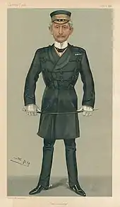From 1890 to 1897 Fox was Inspector of Gymnasia at Aldershot, having succeeded Colonel G. M. Onslow, and financed the expansion of the army athletic grounds and gymnasia at Aldershot using his second wife's money including in 1894 building the gymnasium that was later to bear his name. An expert swordsman, he designed swords for the British Army including the 1895 Infantry Sword Exercise[9] and the Pattern 1897 infantry officer's sword, leading to his 'Swordsmanship' caricature appearing in Vanity Fair in 1896, drawn by Spy. He was also influential in the design of the pattern 1908 cavalry sword.[10] As Inspector of Gymnasia Fox had the responsibility for deciding which skills needed to be incorporated to form the set routines for gymnastics competitions in Scotland.[11] The original gymnasium of 1861 was replaced with the much larger Headquarters Gymnasium in 1894 at the instigation of Fox.[12][13]