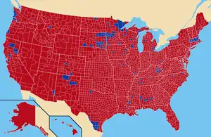 In the election, the McGovern/Shriver ticket suffered a 60.7 percent to 37.5 percent defeat to Nixon and Agnew.[57] At the time, it was the second biggest landslide in American history, with Electoral College totals of 520 to 17. McGovern's two electoral vote victories came in Massachusetts and Washington, D.C.; McGovern failed to win his home state of South Dakota, a state that had delivered for the Democrats in only three of the previous 18 presidential elections in the 20th century.[58] The 1972 election was the first in American history in which a Republican candidate carried every Southern state. Nixon's percentage of the popular vote was only slightly less than Lyndon Johnson's record in the 1964 election, and his margin of victory was slightly larger. Barry Goldwater, who was defeated by Johnson in 1964, sent McGovern a newspaper political cartoon depicting the two of them together "like Grandpa and Granny [patterned after the painting American Gothic] linked by our defeats", with a note scribbled "George – If you must lose, lose big."[26]