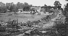 Meade assumed command at Prospect Hall in Frederick, Maryland.[13] Lee's Army of Northern Virginia was invading Pennsylvania and, as a former corps commander, Meade had little knowledge of the disposition of the rest of his new army. Having known Meade during the Mexican War, Lee declared that Meade would make no blunders in his front and that if he (Lee) did so, Meade would readily exploit them. Only three days later Meade confronted Lee in the pivotal Battle of Gettysburg, July 1–3, 1863. The battle began almost by accident, as the result of a chance meeting engagement between Confederate infantry and Union cavalry in Gettysburg on July 1. By the end of the first day, two Union infantry corps had been almost destroyed, but had taken up positions on favorable ground. Meade rushed the remainder of his army to Gettysburg and skillfully deployed his forces for a defensive battle, reacting swiftly to fierce assaults on his line's left, right, and center, culminating in Lee's disastrous assault on the center, known as Pickett's Charge.[14]