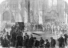 Peabody died in London on November 4, 1869, aged 74, at the house of his friend Sir Curtis Lampson. At the request of the Dean of Westminster, and with the approval of Queen Victoria, he was given a funeral and temporary grave[30] in Westminster Abbey.[31]