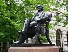 A statue sculpted by William Wetmore Story stands next to the Royal Exchange in the City of London, unveiled by the Prince of Wales in July 1869: Peabody himself was too unwell to attend the ceremony, and died less than four months later.[42] A replica of the same statue, erected in 1890, stands next to the Peabody Institute, in Mount Vernon Park, part of the Mount Vernon neighborhood of Baltimore, Maryland.