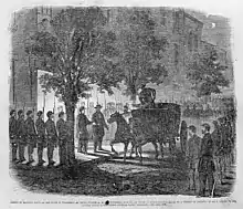 The soldiers fired back, and the scene was one of general mayhem. Marshall Kane soon appeared with a group of policemen from the direction of the Camden Street Station, "and throwing themselves in the rear of the troops, they formed a line in front of the mob, and with drawn revolvers kept it back. ... Marshal Kane's voice shouted, "Keep back, men, or I shoot!" This movement, which I saw myself, was gallantly executed, and was perfectly successful. The mob recoiled like water from a rock."[12] By the time it was over, four soldiers and twelve civilians were dead. These were the first casualties of the American Civil War.