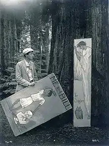 In 1905 Sterling moved 120 miles south to Carmel-by-the-Sea, California, an undeveloped coastal paradise, and soon established a settlement for like-minded Bohemian writers and other children of the counterculture.[4] His aunt, Mrs. Havens, purchased a home for him in Carmel Woods where he lived for six years. Artist Charles Rollo Peters and Robinson Jeffers were influential in Sterling's move to Carmel.[5] A parallel colony of painters was also developing in this enclave. Carmel had been discovered by Charles Warren Stoddard and others, but Sterling made it world-famous. In addition to the Bay Area residents mentioned above, Sterling managed to attract, as either visitors or semi-permanent residents, the satirical iconoclast Ambrose Bierce, novelist Mary Austin,[6] art photographer Arnold Genthe, and writer Clark Ashton Smith. When a firestorm of controversy followed Sterling's publication of A Wine of Wizardry in the Cosmopolitan magazine of September 1907, other rebels flocked to Carmel, including Upton Sinclair and the MacGowan sisters. The suicide by poison of the young poet Nora May French in Sterling's home drew national press coverage.[7][8][9][10] The suicide of Sterling's wife by cyanide only added fuel to the flames. Sterling's own diaries and correspondence reveal a more sedate, but still Bohemian community.[11] He often volunteered at Carmel's Forest Theatre and once played a starring role in Mary Austin's play The Fire.[4] He is depicted twice in Jack London's novels: as Russ Brissenden in the autobiographical Martin Eden (1909) and as Mark Hall in The Valley of the Moon (1913).
