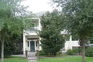 The three-bay south façade has a double gallery, which is not original to the house. The gallery was altered or expanded three times during the twentieth century.[27] In the current configuration, the galleries are accessible from the interior of both stories via doors on the western ends of the south facade. The first-story door, with an architrave featuring colored glass, pilasters, sidelights, and a transom, serves as the house's primary entrance. The lintels of the windows on the south facade have stucco scored to simulate heavy keystones. The sills, original to the house, are made of white Vermont marble.[28]