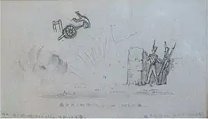 Inside the gate leading to the park we placed two six pounders double charged with grape, one under Acting Sub-Conductor Crow and Sergeant Stewart, with the lighted matches in their hands, and with orders that, if any attempt was made to force the gate, both guns were to be fired at once, and they were to fall back on that part of the Magazine in which Lt Willoughby and I were posted. The principal gate of the Magazine was similarly defended by two guns, with the "chevaux de frieze" laid down on the inside. For the further defence of this gate and the Magazine in its vicinity there were two six pounders so placed as both to command the gate and a small bastion in its vicinity. Within sixty yards of the gate, and in front of the office, and commanding two cross-roads, were three six pounders and one twenty four pounder howitzer which could be so managed as to act on any part of the Magazine in that neighbourhood. After all these guns and howitzers had been placed in the several positions above named they were loaded with double charges of grape.[2]: 76