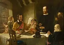 He belonged to a younger branch of the Wisharts of Pitarrow near Fordoun, Kincardineshire. His mother was Elizabeth, sister of Sir James Learmonth, married James Wishart of Pitarrow in April 1512. He was probably called George after his maternal grandfather of granduncle Prior George Leirmont, the name was certainly derived from his mother's family. George's father, James Wishart, died in May 1525, therefore, his mother, Elizabeth together with her brother, Sir James Learmonth of Balcomie, were the two people who were responsible for George's upbringing.[3] Some have suggested that he may have graduated M.A., probably at King's College, Aberdeen,[4] though others, including Wishart biographer Rev. Charles Rogers says that his name does not occur on the records of any Scottish college.[5] He was certainly a student at the University of Leuven, from which he graduated in 1531. Around this time he translated the First Helvetic Confession into English from the Latin.[6] He taught the New Testament in Greek as schoolmaster at Montrose in Angus, until investigated for heresy by the Bishop of Brechin in 1538. He fled to England, where a similar charge was brought against him at Bristol in the following year by Thomas Cromwell. Under examination by Archbishop Thomas Cranmer he recanted some utterances. In 1539 or 1540 he may have visited Germany and Switzerland, but by 1542 he had entered Corpus Christi College, Cambridge, where he studied and taught.[7]