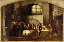 Dundee's East Port (also known as Cowgate Port), the remains of a gateway in the town's walls, is known as the Wishart Arch. The Arch is the only surviving portion of the town's walls, and probably survived owing to a story that George Wishart preached from it in 1544 to plague victims. However this story has been described as 'probably-mythical' and the structure is thought to have been built around 1590, long after Wishart's death.[10] Wishart was also commemorated in Dundee with a United Presbyterian church being named after him. Wishart church was built in Dundee' Cowgate in 1841 and could seat over 700 people. It was this church that the missionary Mary Slessor was a member of when she lived in Dundee. It was renamed Wishart Memorial Church in 1901, a year after it had become part of the United Free Church of Scotland, and 1929 became part of the Church of Scotland. In 1975 the church congregation was united with Dundee church and the building was sold to Dundee Cyrenians who turned it into a hostel for people with alcohol problems called the Wishart Centre.[11] There is a house at Saint Kentigern College in Auckland, New Zealand, named after him. A lodge of the Scottish Orange Order, formed with a warrant in Dundee but often meeting in near by Forfar, is named The Wishart Arch Defenders in his honour.