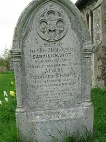 Georges Chanot III died in London in 1895. In his will he left £3355 5s 8d.[5] He was buried with his wife in St Mary's churchyard in Sydenham in Oxfordshire, where his wife's family came from.