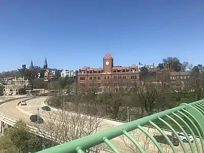 The next-door resident of the Prospect House, who furnished affidavits by prominent architects, opposed the building's construction by stating that blasting from the construction was damaging her house. This led to court-ordered supervision of the blasting in 1894.[12] After the Car Barn's construction, the large edifice obstructed the view of the Potomac River and Virginia from homes on Prospect Street, including the well-known cottage of E. D. E. N. Southworth.[lower-alpha 1] For this reason, some considered it a "desecration" of the local scenery.[13]