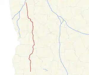 SR 41 begins at an intersection with SR 45 (North Bermuda Street) just north of Morgan, in Calhoun County. The route travels through rural areas of the county before it very briefly runs along the Calhoun–Randolph county line. Then, it enters Randolph County proper. It continues to the north and enters Shellman. On the far northeastern edge of town, it begins a brief concurrency with US 82/SR 50. At the end of the concurrency, the three highways reach the Randolph–Terrell county line. When SR 41 splits off, it runs along the county line for about 1.5 miles (2.4 km). Then, it travels to the northwest and curves to the north-northeast before entering Webster County. In Weston, it intersects SR 520. Northeast, in Preston, is a one-block concurrency with US 280/SR 27 (Hamilton Street). Just before leaving town, it meets the southern terminus of SR 153. The road heads north-northwest, traveling very briefly along the Webster–Marion county line. Then, it curves to the north-northeast and meets the western terminus of SR 30 before it curves back to the north-northwest. Just before entering Buena Vista, it passes by Marion County Airport. In town, the highway intersects SR 26 (6th Avenue). Three blocks later, it intersects SR 137 (3rd Avenue). The two routes run concurrent to the west. One block later, at Baker Street, SR 41/SR 137 turn to the north after meeting the northern terminus of SR 41 Connector. Just over 1,000 feet (300 m) later, the two routes head to the west-northwest and curve to the northwest. Just outside town, the two highways diverge, with SR 41 gradually curve more to the north and meets the southern terminus of SR 352 along the way. It heads due north, passing Melton Lake. Then, it begins a gradual curve to the northwest, meeting the western terminus of SR 127 and the southern terminus of SR 267 along the way. After that, it curves to the due north and crosses over Juniper Creek into Talbot County. SR 41 joins US 80/SR 22/SR 540 in a concurrency to Geneva. At the meeting point of the western terminus of SR 96, US 80/SR 22/SR 41 turn to the left. The concurrency continues into Talbotton. They intersect SR 90/SR 208 (Clark Street). The latter route joins the concurrency until Monroe Street. Just over four blocks later, SR 41 departs to the north on Washington Avenue and then crosses over Lazer Creek. Farther to the north, in Greens Mill, SR 36 begins a concurrency to the north-northeast. The two routes enter Woodland, where SR 36 splits off onto 1st Street. SR 41 curves to the west-northwest and meets the eastern terminus of SR 116 before traveling to the northwest. Just before entering Manchester, US 27 Alternate/SR 85 begin a concurrency with it. US 27 Alternate and SR 41 are concurrent for the remainder of SR 41's length. Then, they cross into Meriwether County. At 2nd Street, US 27 Alternate/SR 41 turn to the left, while SR 85 continues to the northeast. Then, at 5th Avenue, the two routes turn right. The concurrency curves to the northwest and meet the western terminus of SR 85 Spur (Perry Street). On the northwestern edge of town, they meet the southern terminus of SR 173 (Raleigh Road). They continue to the northwest and enter Warm Springs, where they intersect SR 85 Alternate (Whitehouse Highway). Just before leaving town, they pass Warm Springs Medical Center. Right after passing the Roosevelt Memorial Golf Course, they meet the eastern terminus of SR 194 (Durand Highway). They head north and pass Brae-Tam Lake and Roosevelt Memorial Airport. In Harris City, the two highways pass Phillips Lake and intersect SR 18, which joins the concurrency. In Greenville, they intersect SR 109, which joins the concurrency around the town square. Here, SR 18 splits off to the east. US 27 Alternate/SR 41 continue to the north-northwest and pass through rural areas of the county and enter Luthersville. In town, they meet the southern terminus of SR 54 Spur (Park Street). Less than 500 feet (150 m) later, they intersect SR 54 (Oak Street). Just under 1 mile (1.6 km) after leaving town, they enter Coweta County. The two routes pass through rural areas of the county and intersect US 29/SR 14 on the southeastern edge of Moreland. At this intersection, SR 41 meets its northern terminus, while the other three routes continue to the north-northwest into Newnan.[1]