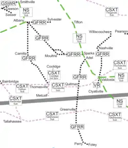 The Georgia and Florida Railway (reporting mark GFRR) is a short line railroad operating in Georgia and Florida, and is a subsidiary of OmniTRAX. The railroad spans 297 miles (478 km) over numerous different rail lines, most of which radiate out of Albany, Georgia.[1]