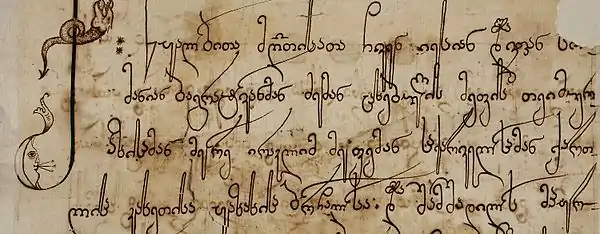 Georgian calligraphy (Georgian: ქართული კალიგრაფია kartuli k'aligrapia) is a form of calligraphy, or artistic writing of the Georgian language using its three Georgian scripts.