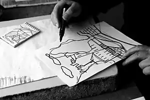 Georgy Kovenchuk traveled a lot in the 1980s and 2000s. On a regular basis for many years he lived and worked in France, Paris and other European countries (Sweden, England, Germany, Poland, Monaco, Finland, etc.), the USA, Japan and China, Tunisia. A special place in the artist's creative heritage is occupied by the picturesque and graphic series of works created in Paris on the Rue Lepic (such as Moulin Rouge).[5] The artist throughout his life he met, worked, communicated or made joint creative projects with many outstanding people of that time, among them were: Nikolay Akimov, Georg Solti, Aleksei Kruchenykh, Alexei Khvostenko, Oleg Tselkov, Marc Chagall, Lilya Brik, Marlene Dietrich, Otar Iosseliani, Bulat Okudzhava, Daniil Granin, Sergei Dovlatov, Andrei Bitov, Jan Kubíček.[6]