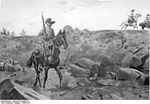 The Germans then offered terms under which they would surrender but they were rejected by Botha and the war continued.[7] On 12 May Botha declared martial law and having cut the colony in half, divided his forces into four contingents under Coen Brits, Lukin, Manie Botha and Myburgh. Brits went north to Otjiwarongo, Outjo and Etosha Pan which cut off German forces in the interior from the coastal regions of Kunene and Kaokoveld. The other three columns fanned out into the north-east. Lukin went along the railway line running from Swakopmund to Tsumeb. The other two columns advanced on Lukin's right flank, Myburgh to Otavi junction and Manie Botha to Tsumeb and the line's terminus. The men who commanded these columns, having gained their military experience fighting in Boer commandos, moved very rapidly.[8] The German forces in the north-west made a stand at Otavi on 1 July but were beaten and surrendered at Khorab on 9 July 1915.[9]