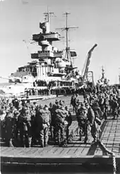 Following her return from the North Sea sortie, Admiral Hipper was assigned to the forces tasked with the invasion of Norway, codenamed Operation Weserübung.[13] The ship was assigned as the flagship of Group 2, along with the destroyers Paul Jakobi, Theodor Riedel, Friedrich Eckoldt, and Bruno Heinemann. KzS Heye was given command of Group 2 during the operation.[15] The five ships carried a total of 1,700 Wehrmacht mountain troops, whose objective was the port of Trondheim; the ships loaded the troops in Cuxhaven.[13][16] The ships steamed to the Schillig roadstead outside Wilhelmshaven, where they joined Group 1, consisting of ten destroyers, and the battleships Scharnhorst and Gneisenau, which were assigned to cover Groups 1 and 2. The ships steamed out of the roadstead at midnight on the night of 6–7 April.[17]