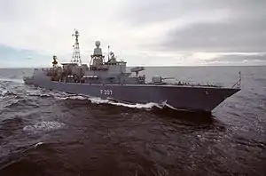Bremen participated in various international missions during her career. She was frequently deployed to participate in NATO permanent monitoring missions in the Mediterranean during the Gulf War in 1991. In late January 1992 she escorted the German freighter Godewind into Cartagena, Spain. The Godewind had been intercepted in the Mediterranean by the destroyer Mölders while transporting T-72 tanks from Poland to Syria without German permission.[2] From 1992 to 1996 Bremen was active in the Adriatic Sea as part of NATO's Operation Sharp Guard, the maritime blockade of the former Yugoslavia during the Yugoslav Wars.[3] From 2002 she served in the counter-terrorism Operation Enduring Freedom. In 2009 Bremen joined Operation Atalanta, the EU's anti-piracy mission off the Horn of Africa. On 14 August 2009 she deployed her helicopter to counter a pirate attack on the Turkish-flagged merchant ship MS Elgiznur Cebi.[4][5] On encountering a pirate skiff and six pirates, the helicopter fired warning shots to force it to stop. The skiff was then seized by the Greek frigate Narvarinon, which found weapons and boarding ladders.[4] In May 2012 Bremen was again deployed with Operation Atalanta, taking over from the replenishment oiler Berlin, in a ceremony attended by German Secretary of State Thomas Kossendey.[6] Bremen was relieved from these duties in September 2012 by the Sachsen-class frigate Sachsen.[7]