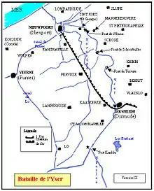 The Battle of the Yser took place in October 1914 along a 35 km (22 mi) long stretch of the Yser river and Yperlee canal in Belgium.[45] On 15 October c. 50,000 Belgian troops ended their retreat from Antwerp and took post between Nieuwpoort and French Fusiliers Marins at Diksmuide, which marked the end of the "Race to the Sea". Both sides conducted offensives and when the attacks by the Tenth Army and the BEF to Lille was defeated in early October, more French troops were sent to the north and formed the Détachement d'Armée de Belgique ("Army Detachment of Belgium") under the command of General Victor d'Urbal.[46] Falkenhayn assembled a new 4th Army from the III Reserve Corps, available since the fall of Antwerp and four new reserve corps, which had been raised in Germany in August and were deficient in training, weapons, equipment and leadership. The 4th Army offensive along the coast to St. Omer, began with operations against the Belgians, to drive them back from the Yser.[47]