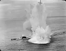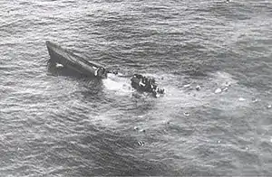 The U-boat, now under the command of Oberleutnant zur See Siegfried Straub, left Brest on 29 February 1944 on her tenth and final patrol.[17] On 10 March, west of Ireland, in position 52°35′N 20°19′W, she was sunk by depth charges from a Canadian Sunderland patrol bomber EK591 "2U" from No. 422 Squadron RCAF. All 53 hands were lost.[1] "The crew of the Canadian amphibious plane, the Sunderland, reported that it had sunk a German U-boat off the west coast of Ireland and that the crew were swimming around in the water. Pictures of the attack & sinking of U-625, and of some of the crew that escaped in liferafts (not all), were taken by the cameras aboard the Sunderland. The plane circled a few times and headed back to its home base. None of the submarine crew survived; before having a chance to be rescued, they were lost in high seas. Those pictures hung in the office of Sir Winston Churchill for a period during the war; it was the only confirmed proof of a U-boat "kill" by a Canadian coastal squadron during World War II. U-625 was one of 543 German ships that went lost together with its entire crew" (Neitzel & Welzer 2012:261, with two photos on p. 262 of U-625 being attacked and about half of the crew clustered together in the water in one-man rafts.)