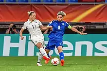 For the draw of the final round groups on 8 November 2016, Germany was assigned pot 1 together with the host Netherlands, England and France and allocated to group B as group head. Opponents were Sweden, Italy and Russia, making it the only group without a freshman and neighborhood duel. Germany started with a goalless draw against Sweden, which made it the first time in the encounter with the Scandinavians no winner. It was won against Italy and Russia, but the goals were scored by defender Marozsán and captain.[8][9][10] As a group winner, the German team then met in the quarterfinals on Denmark. However, the game could not take place on the scheduled date, because the place was unplayable due to continuous rain. One day later, both arrived at the unusual lunchtime for them. The German team seemed to be more alert at first, taking the lead in the third minute with an Isabel Kerschowski long shot from the Danish goalkeeper. The leadership paralyzed but rather the German team rather than give her safety and as a result increased not only the Danish goalkeeper, but their entire team, so that Germany came to no significant scoring chances. Shortly after the half-time break, they were able to equalize first and finally turn the game in the 83rd minute. As the German players then no longer managed to score chances, Germany dropped out of the quarter-finals for the first time in a European Championship finals.[11] Shortly after the European Championship, striker Anja Mittag announced her retirement from the national team.