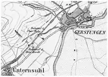 With the founding of the German Empire in 1871, the Prussian state railways were commissioned to ensure a unification of the railway networks of the Empire. This soon led to the takeover of the small state railways on the rail network.[3] In 1882, both railway companies were bought up by the Prussian state railways, and the Hessian station was closed. Gerstungen acquired a special operational importance in 1898 with the opening of the main marshalling yard between Kassel and Weißenfels. Since the opening of the Gerstungen–Berka line on 1 October 1903, which was extended in stages to Vacha in 1905, Gerstungen station became a junction station. During the Second World War, the station was identified as a strategic destination and bombed in 1944. During this raid, adjacent houses were also hit and several inhabitants were killed. Trains running on the Gerstungen–Eisenach section were also attacked from the air.[4]